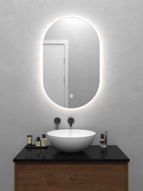 Безрамное зеркало овальной (капсульной) формы с контурной (тыльной) нейтральной подсветкой, свет 4000К. Подложка из высококачественного МДФ, светодиодная лента защищена матовым свето-рассеивателем от попадания пыли и влаги. Есть вывод 220W для подключения к сети, включение подсветки от сенсорной кнопки на зеркале.